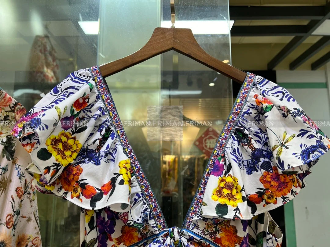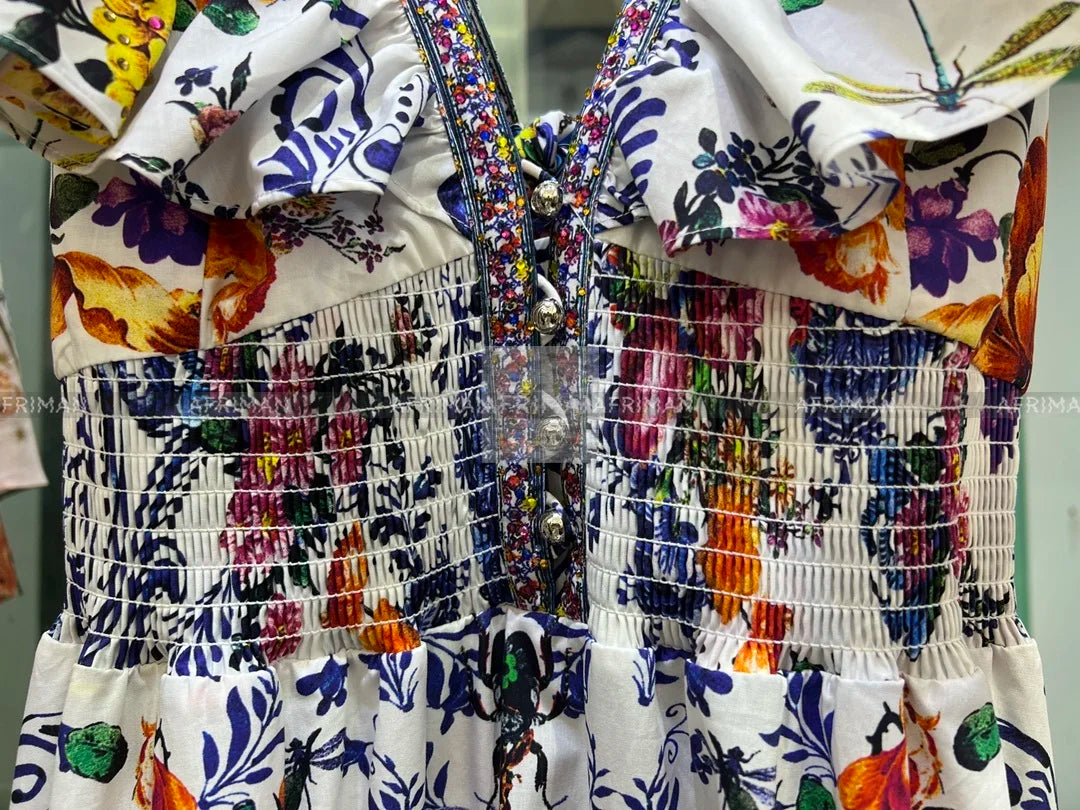 • This exquisite designer dress beautifully blends vintage style with modern comfort, making it a timeless addition to any wardrobe. Crafted from a luxurious cotton and linen blend with slight stretch, the dress offers a comfortable yet elegant fit. The V-neckline, adorned with delicate beading, adds a touch of sophistication, while the flying sleeves bring a playful and graceful element to the design.